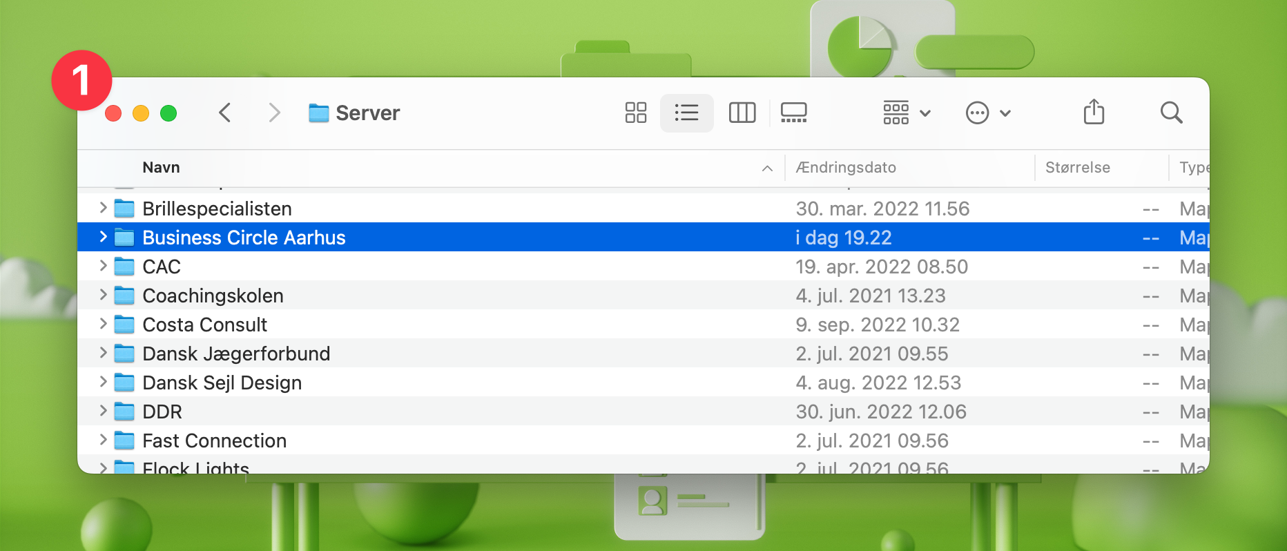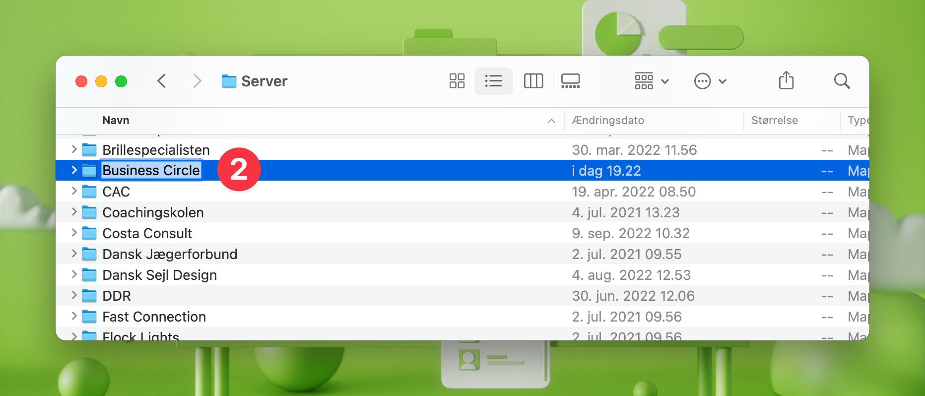 Server med kundemapper (valgt mappe er klar til ændring af navn)